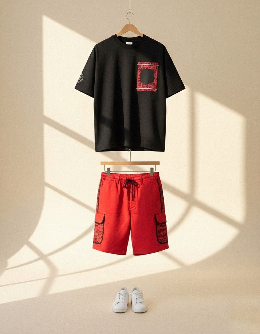The black seempull T-shirt anchors the look with clean structure and subtle detailing, while the red Ohuru short inject confidence through contrast, texture, and function. Together, they strike that sweet spot between laid-back street style and intentional design.