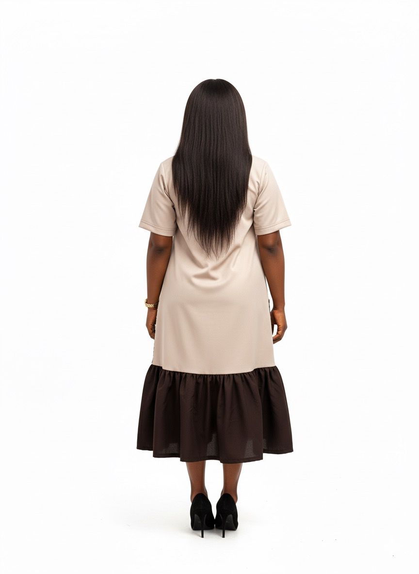The Etana Zuri dress is a celebration of quiet strength and refined style. Crafted for the modern African woman who embraces simplicity with depth, this piece combines soft beige tones with bold, glittering Etana print pockets that shimmer subtly under light.